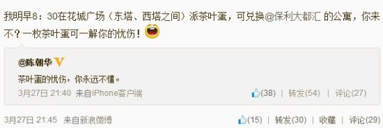 地产大佬今早花城广场怒派10万茶叶蛋。早上8点半,@余英 在珠江新城花城广场免费派10万个茶叶蛋。每人可领一个,台湾同胞特惠,一人两个!!!10万只茶叶蛋,6.25吨,若派3小时,每秒要派9个。迎着雾霾,左手泡面,右手捧蛋,眼噙泪花,茶叶蛋在手,天下我有……