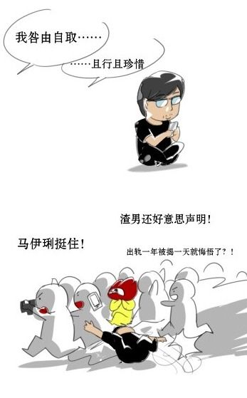 事情正当风口浪尖的时候,渣男和小三都会遭到众人的唾弃;可时过境迁之后,待遇却大不相同:男人多认几次错,老实一阵子,就是迷途知返、回头是岸,渐渐得到大家的原谅,甚至还可能被树为改造良好的成熟男人典型;小三则永远是小三,一辈子被钉在耻辱柱上。总之为难女人的,永远是女人。(via. 小野妹子学吐槽)