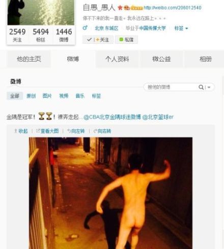 太High了!北京球迷疯狂裸奔。同样是3月30日,北京球迷一夜穿越回两年前那个激动人心的夜晚,或许是730天的等待太过漫长,有一位名为“@自愚_愚人 ”的网友赛后在新浪微博上贴出了自己的裸奔照,并激动的配上了“金隅是冠军!!裸奔走起…”的文字。