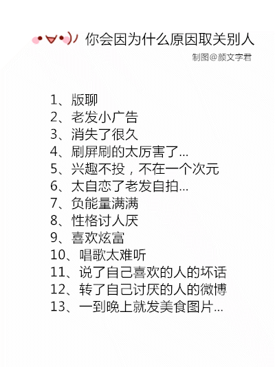 所以这些都足以造成我微薄取关!还有无病呻吟型的,高调晒甜蜜的,嘴损无极限的,自我感觉高大上的!实在忍受不了,分分种取关!(via. 云之幻彩)