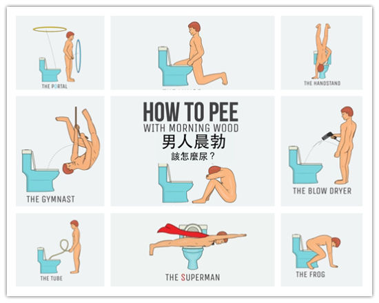 朝气“勃勃”怎么尿?图解男人早上尿尿9式。1.等待;2.蛙蹲式;3.弓箭步式;4.水管式;5.吹风机式;6.传送门式;7.体操选手;8.倒立式;9.超人式。