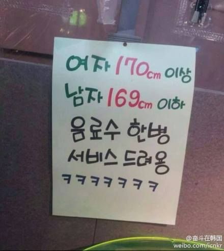 韩国一老板在店里写着:女的身高170cm以上,男的身高169cm以下,免费送一瓶饮料女的身高超过170都被列入关怀对象啦??