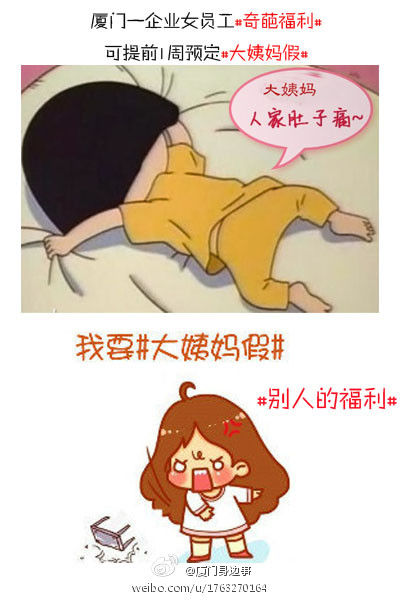 厦门一企业女员工#奇葩福利# 可提前1周预定#大姨妈假#。半天带薪假,提前1周预定,每月1次,厦门一企业公布新福利,女员工享受每月半日带薪姨妈假,不影响正常考勤,该福利一公布便引网友热议:好贴心我也要姨妈假。男同事:希望父亲节也有假。
