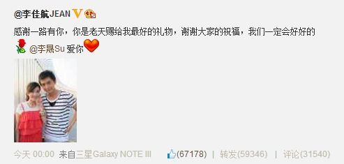 尔康小燕子在一起了!今日零点,@李佳航JEAN 通过微博公布与@李晟Su 恋情并向女友示爱,还附上亲密合影,称:“感谢一路有你,你是老天赐给我最好的礼物,谢谢大家的祝福,我们一定会好好的,爱你!”照片中两人头挨头,幸福感全写在了脸上。