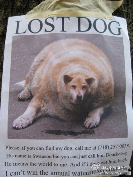 美国一位哥们养了一条胃口超级好的狗狗,每年他都会带他去参加当地的吃西瓜大赛,并且在比赛中屡获佳绩,但是最近这条狗突然失踪了,主人非常焦急,贴出了宠物招领。我觉得这狗吧,应该挺好认的……