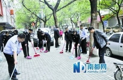 河南信阳一张创卫大扫除照被疑摆拍。信阳日报刊照:十来名城管队员在干净地面上“埋头苦干”。@熊熊就是马子大 :这么多人扫那么小一块地方,还排成U形阵容,难道是武侠中的阵法? @老榕 :放大图片也没找到他们在扫什么。城管办主任否认摆拍,称网友误解让他委屈。