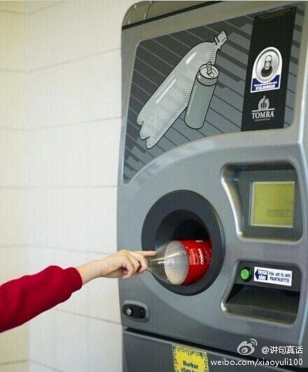 学习瑞典,为了促进环保,瑞典制定了饮料瓶回收90%的目标,在购买饮料时,必须先付瓶子的押金,一般是0.5-2瑞典克朗,喝完饮料后,将瓶子投入专门的回收机(超市里有),就能获得一张回收金额的小票,凭小票可以在超市获得退款或直接消费。目前,89%左右的铝罐、塑料瓶都得到了重复利用~