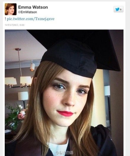 布朗大学英语文学专业学生Emma Watson今天毕业。她在推特po出学士服自拍以示庆祝。Emma说第一次去食堂吃饭时,所有人都停下来盯着她看。后来她跟大家打成一片,发现同学人都很耐斯,没人逼她要签名,开派对时也没人偷拍po到网上。她还因英美语言差异而闹过笑话,比如在教室大喊“谁有套套!”(via. 谷大白话)
