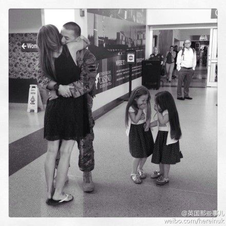 海外驻扎回来的丈夫和妻子在机场相遇....... 两个小女儿一脸坏笑简直可爱爆了~~~~(via. 英国那些事儿)