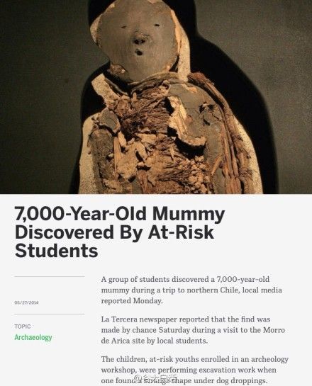 智利一群参加考古班的"劣等生"无意间搞出惊天发现。这群学生在智利北部地区进行考古挖掘实地练习时,竟然从一堆汪星人便便下面挖出了7000年前的木乃伊!该木乃伊属于美洲的Chinchorro文明,可能是因为四月的一场8.2级地震而被翻到地表。其实这些都不是槽点,槽点是木乃伊蠢萌的长相…(via. 谷大白话)