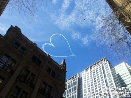 网友在悉尼CBD拍到的一幕,有人通过用飞机在天空划爱心求爱。简直酷毙了!