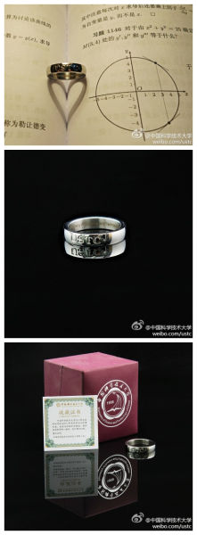 你收过“毕业戒指”吗?学校发的!中国科学技术大学为2014届毕业生打造了5980枚毕业戒指,作为送给毕业生的礼物。戒指是限量打造,钛钢合金,正面刻有“USTC”(校名英文缩写),背面刻有“2014—编号”,每枚都独一无二。你们发了啥?别说是离校手续单…(via. 人民日报)