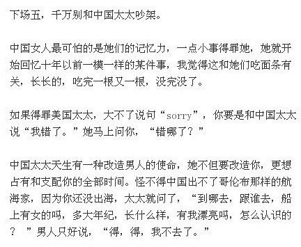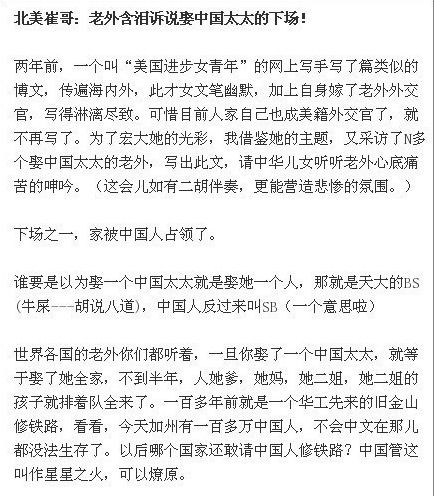 老外含泪诉说娶中国太太的下场!作者北美崔哥采访了N多个娶中国太太的老外,写出此文,请中华儿女听听老外心底痛苦的呻吟。