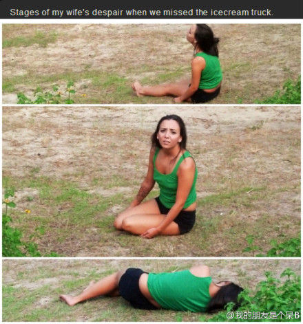 网友zattack1303说他老婆因为错过了冰激凌车,奔溃绝望的三部曲。。。真是吃货的忧桑。(via. 我的朋友是个呆B)