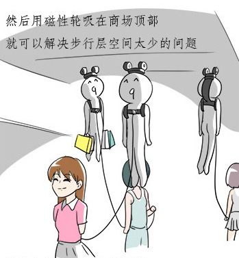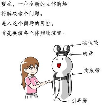 设想了一种立体商场,可以一劳永逸地解决男人逛商场遇到的问题。(via. 使徒子)