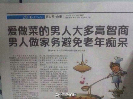 【爱做菜男人大多高智商 避免患老年痴呆症】最新科研:爱进厨房男人大多高智商,因他更能了解和满足家人诉求,男人做家务会给家庭成员起到模范作用,让亲人感受家庭温暖,有利构建和谐家庭,而且做家务要用眼嘴脑手,可延缓大脑衰老避免老年痴呆。。。看到这里,你想@ 谁?(via. 班主任的课)