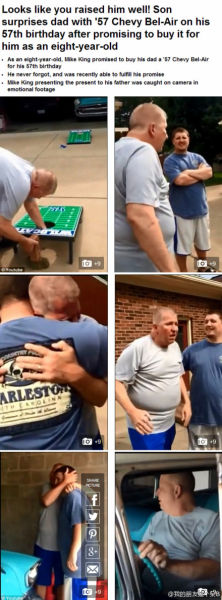 我的朋友是个呆B:美国一个小伙儿 Mike,养父Roger 对他特别特别好,8岁的时候他就承诺会给爸爸在57岁生日的时候买辆车,这个承诺他一直记在心里,今年养父57岁, Mike31岁,他真的兑现了自己的承诺,当父亲看见车的时候,眼眶立刻湿了。。Mike说虽然Roger不是亲生父亲,但是对他和妈妈来说却是这辈子最好的恩赐。