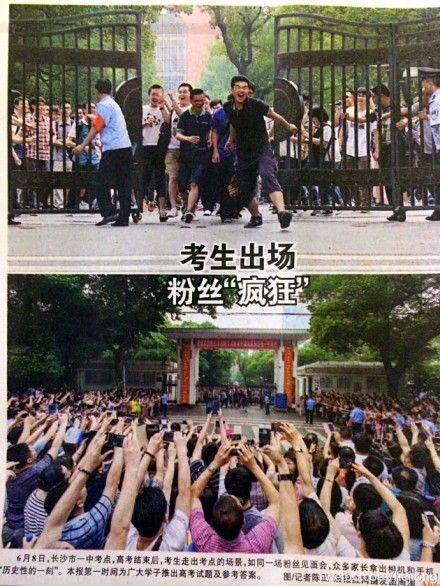 这图这阵仗我服了。这是天团待遇啊!考生家长是一辈子的真爱粉!话说领头的小哥你也太欢乐啦吧!(via. 何炅)