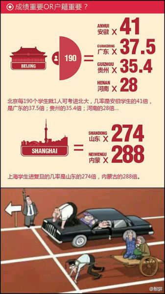 北京考生:“老爸,我考了530,比一本分数线高53分!”“儿子真有出息,走去上海旅游去!”安徽考生:“爸,我考530,跟二本线差了20分。”“真没出息,别念了,滚上海打工去吧!”上海考生:“爸,我才考230,送我出国吧!”“行,去学个工商管理回来帮我吧,今年又从安徽招了不少农民工。(via. @敖評)