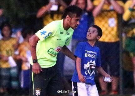 一个八岁的小男孩突破警戒线闯入巴西队训练,正当安保采取措施时,内马尔解救了他,并带他参观巴西队训练。媒体一致赞扬内马尔的爱心。(via. LifeTime)