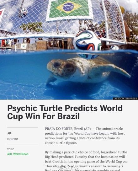 还记得上届世界杯的预言帝章鱼保罗吗?最近巴西也有了自己的通灵神兽:一头25岁的雄海龟。为预测首场比赛战果,海龟保育中心员工将鱼挂在巴西国旗、克罗地亚国旗和象征平局的足球下面。海龟对着足球犹豫片刻,最终选了巴西,全场立刻响起雷鸣般的掌声。这头海龟名叫Cabecao,中文意思是“大头”。(via. 谷大白话)