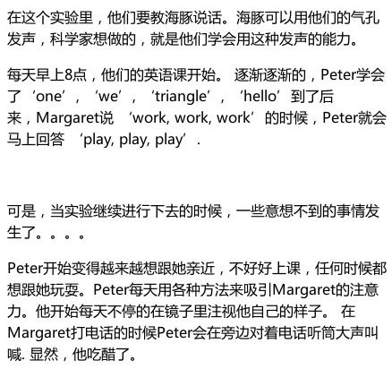 【纪录片片段】@英国那些事儿发的,说50年前英国秘密实验,女孩教海豚说话,后来被海豚爱上的故事。。。在这段2分钟的片段里,有当时海豚学说话的录音(不得不说学的并不像),还有现在已经是老太太的Magritte讲述的,海豚发情时,他们采取的,一。些。措。施。(via. YouTube精选)