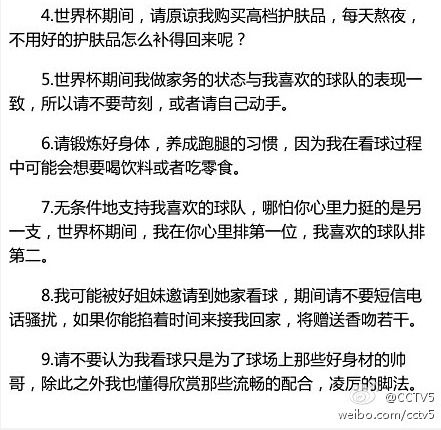 【女球迷制定的世界杯男人守则】世界杯不是男人的专属,女球迷一样对世界杯很痴迷!来看看某女球迷为男人制定的世界杯守则:进球后,我用高八度声音欢呼时,请不要斥责我没有淑女气质;世界杯期间我做家务状态与我喜欢的球队表现一致;无条件地支持我的球队,哪怕你心里力挺的是另一支。