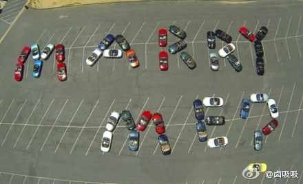 求婚方式繁多,从烛光晚餐到广场超大屏幕都有,美国一位大哥觉得这些方法都比较老套,想了很久,最后还是决定用44辆敞篷车拼写出:marry me,从高空用微型飞行器拍下照片向女友求婚,btw,这是有史以来规模最大的汽车拼图。(via. 卤吸吸)