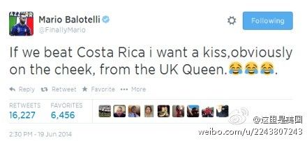 【巴神的世界,又不懂了吧?】英格兰1-2负于乌拉圭队之后,巴神发推:“如果我们击败哥斯达黎加,我想让英国女王亲一下我的脸。”不过,英格兰队要想出线,还真需要意大利队帮助:假设意大利明天击败哥斯达黎加,小组赛最后一轮击败乌拉圭;而英格兰最后赢哥斯达黎加至少2球,才能凭净胜球出线。(via. 这里是美国)