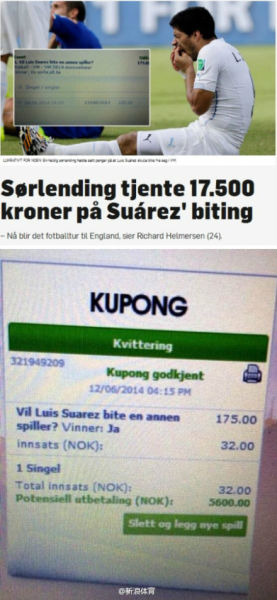 【没天理!俩球迷赌中苏牙咬人净赚175倍】真就有球迷事前在当地博彩公司投注了“苏亚雷斯咬人”,赔率高达1赔175!为此,这球迷还遭到朋友嘲笑。但血淋淋的一幕却让他“一口赚翻”!另一位挪威网友同样凭借苏牙咬人,赚了瓢满钵满。投注32元挪威币,最后得到5600。