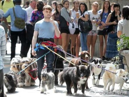 【丹尼尔拍新片“腰缠万狗”变狗贩子】“哈利”丹尼尔·雷德克里夫1日牵9条狗现身纽约大街,吸引大批路人驻足围观。难道是哈利施展魔法吸引汪星人围观?no~这是他参与贾德·阿帕图新作《Trainwreck》的拍摄场景,片场丹尼尔神情憔悴地不断抽烟,这是要从正太变熟男的节奏吗?网友调侃道真想扔根骨头试试。