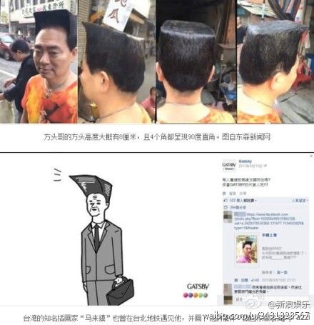 #方头哥出没#发型高度大概有8厘米,且4个角都呈现90度……为虾米要这样梳头?因为情感受挫……当初他因为被心仪女生拒绝,才会想改变造型,但这个发型每次得用掉2罐发胶,一次要花2小时的时间…台湾的知名插画家直呼“脑中一直都是他的身影”。