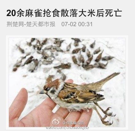 20多只麻雀吃了散落大米,全都倒毙。专家称,麻雀是撑死的。以前是“早起的鸟儿有虫吃”,现在是“早起的鸟儿能撑死”,可怜的麻雀,要是在朝鲜,就不会这么悲催了。(via. 作家崔成浩)