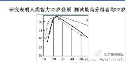 【人的智力22岁登顶 27岁开始变笨】弗吉尼亚大学科研人员历时七年,对两千名18岁至60岁之间的男性和女性进行测试,结果表明人的智力在22岁时达到顶峰,而仅在5年之后,27岁时就开始变笨。(via. 这里是美国)