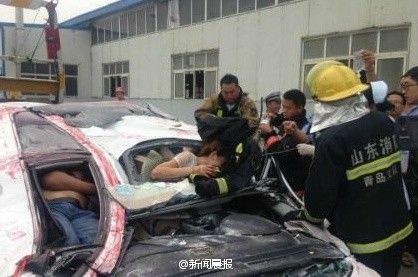 【轿车被集卡压扁 车内女司机奇迹生还】7月22日一早,山东青岛正阳西路前程村路口处发生一起车祸,集装箱半挂车驾驶员被困,轿车内两人被困。经过半个小时的不懈努力,轿车内被困女司机终于被成功营救。