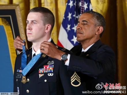 【美军大兵曾单挑200塔利班成员 获总统亲授荣誉勋章】21日在美国华盛顿,奥巴马亲自给28岁的美国陆军前中士Ryan Pitts佩戴上了荣誉勋章,表彰其在阿富汗战斗中的英勇表现。据报道,Ryan Pitts曾在一场战斗中,单枪匹马与200名塔利班成员大战了90分钟,当时他虽然身受重伤,仍然坚持战斗。(via. 这里是美国)