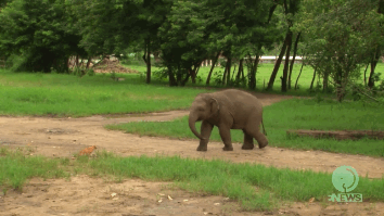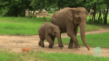 一只小象和麻麻散步,路遇一只喵星人,本来都走过去了谁知小象又返回欲驱赶喵,那销魂的小腿一蹬简直傲娇到没药医,最后徒留喵星人一脸卧槽我招你惹你了的暗自伤神在原地...。.