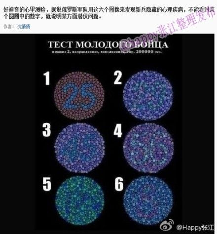 好神奇的心里测验,据说俄罗斯军队用这六个图像来发现新兵隐藏的心理疾病,不能看到某个圆圈中的数字,就说明某方面潜伏问题。不见1,侵略性强;不见2,智力较低;不见3,生活放荡败坏;不见4,倾向暴力领导;不见5,可能轻易被同性吸引,有潜在的同性恋倾向;不见6,可能轻易会精神分裂,需要额外关注。(via. Happy张江)