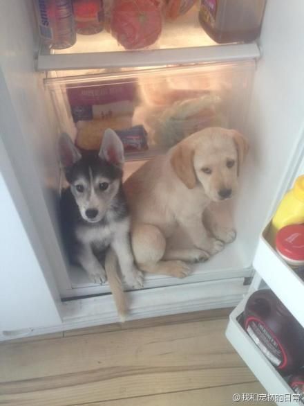 家里俩蠢狗,天气太热,躲进冰箱里不肯出来。叫它们出来,一个很委屈的眼神看着我我,一个假装听不见。(via. 我和宠物的日常)
