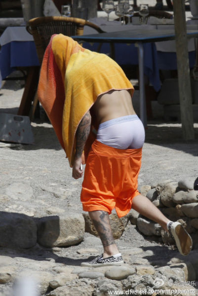 【比伯浴巾遮脸内裤全露】当地时间8月3日,比伯在西班牙伊维萨岛度假。只见比伯沙滩裤下滑大露白色底裤。被打后的比伯似乎更加娇弱,全程上下船都由壮汉保镖搀扶。露脸还是露底裤,这是一个问题。(via. 新浪娱乐)