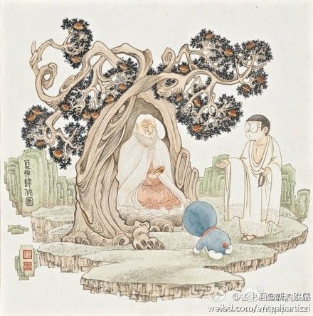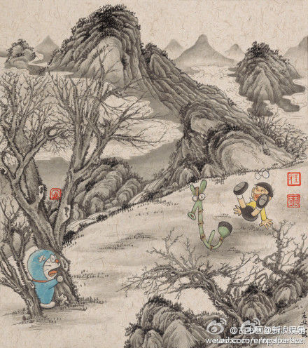 【感觉古画萌萌哒!】蓝胖子和大雄在干嘛?故宫博物院@古书画复制人王赫 突发奇想,将哆啦A梦和大雄“穿越”到中国古画中,有任意门、时光机、竹蜻蜓、漂流瓶……看起来毫无违和感。还有古人喝上咖啡,李白用上相机,简直萌萌哒!