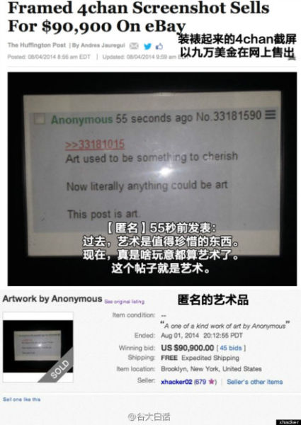【一条帖子卖九万】有人把4chan网站上的某个帖子截屏打印,装裱起来,放在网上拍卖。开始底价是500美元,最终以九万多美元的价格售出......