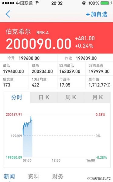 【巴菲特公司股票突破20万美元 买一股需要人民币123万】伯克希尔-哈撒韦公司A类股票首次突破20万美元,创历史最高纪录。买一股的话需要123万元,买一手要1.2亿!这是一支连@王思聪 下手都要抖三抖的股票!(via. 互联网的那点事)