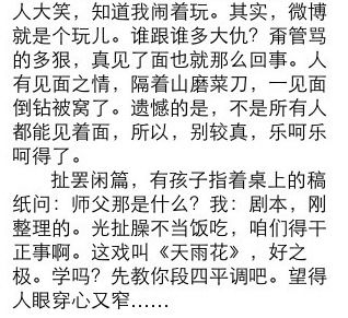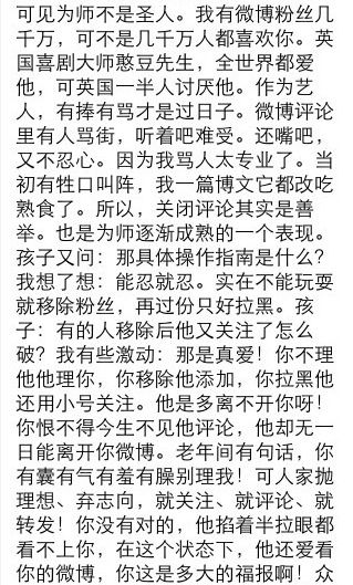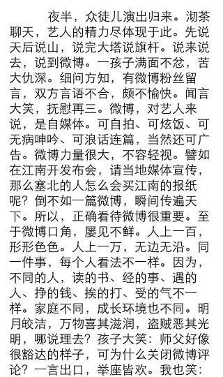 夜半,众徒儿演出归来。沏茶聊天,艺人的精力尽体现于此。先说天后说山,说完大塔说旗杆。说来说去,说到微博。一孩子满面不忿,苦大仇深。细问方知,有微博粉丝留言,双方言语不合,颇不愉快。闻言大笑,抚慰再三。微博,对艺人来说,.。.(全文见图)(via. @郭德纲)