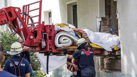 【325公斤女子出门看病】8月13日,柏林一42岁女子突发疾病想去医院。但她那325公斤的身躯,让房门显得过于狭窄,以致无法通行。闻讯到场的消防人员,决定破拆墙壁展开拯救……借助冲击钻、十字镐、起重机,女子最终成功出门。