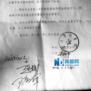 昨日下午,登封市公安局副局长赵建勋表示,登封市公安局曾调查梁松帅一案,但因为被举报的警察都不承认打人,而梁却在派出所受了伤,就跟他签了那份赔偿协议书,以尽快化解矛盾。 南都记者 孙旭阳