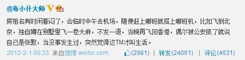 房祖名有时闲着闷了,会临时中午去机场,随便赶上哪班就搭上哪班机,比如飞到北京,独自蹲在别墅里飞一卷大麻,不发一语,当晚再飞回香港,偶尔被公安抓了就说自己是张默,当没事发生过,突然觉得这TM才叫生活。(via. @布小什大师)