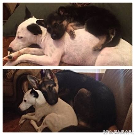 Imgur网友Valcheebonch说他们家小黑一直喜欢趴在大白的身上睡觉,等长成了大黑还是喜欢趴在大白身上睡觉。。。。大白一脸无奈。