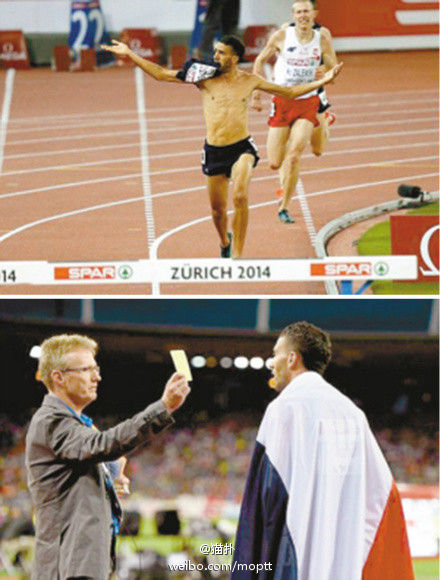 【no zuo no die 田径选手脱衣庆祝被罚丢金牌】前几日结束的田径欧锦赛上,名叫梅吉西·本巴的法国田径选手在3000米障碍赛中一路领先,眼看终点就在眼前,本巴兴奋地脱下了上衣,咬着运动衣朝终点奔去。结果却收到裁判的一张黄牌警告,裁判经过商议后决定取消本巴的成绩。