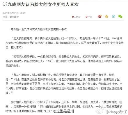 】“脸大的女孩旺夫,做个快乐的大脸姑娘,找一个好男人,然后旺他一辈子!”13日,5600名网友参与“你相信脸大是旺夫相吗”的调查,超过89%的网友认为,瓜子脸太普遍了,脸大的女生很有特色,招人喜欢!大脸姑娘的春天来了!(via. Happy张江)